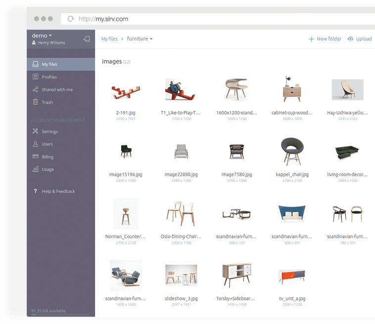 Serve any image, to any website at any size. Just upload your original hi-res images to Sirv and they’re instantly ready to be delivered, perfectly optimized. Neatly organized and searchable by anyone in your organization, saving you time and properly managing your valuable assets.