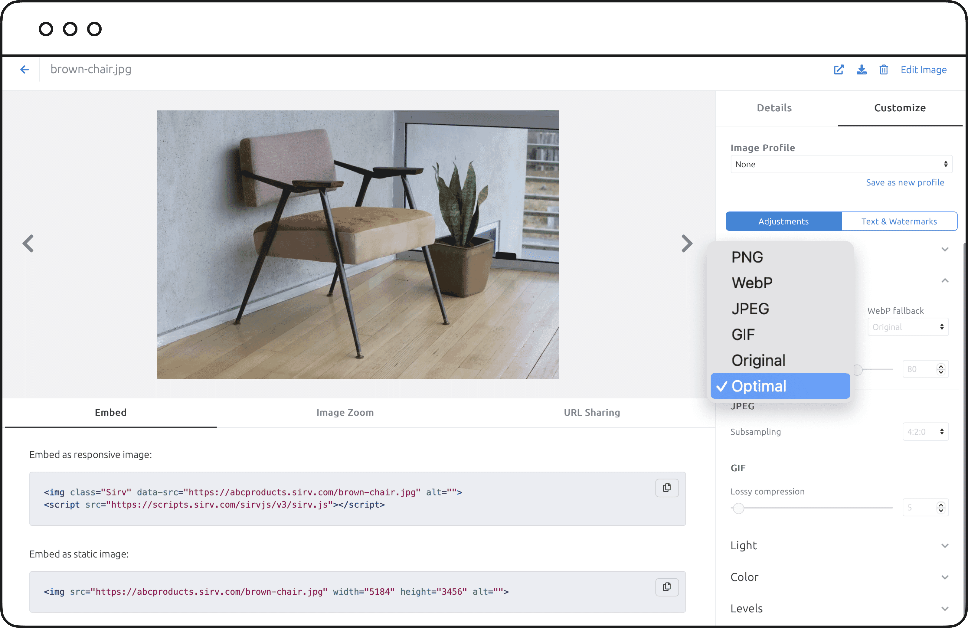Sirv provides dedicated plugins for WordPress, Magento, PrestaShop, BigCommerce, Shopify and more. You can quickly add it to your website to enjoy the best optimized images.